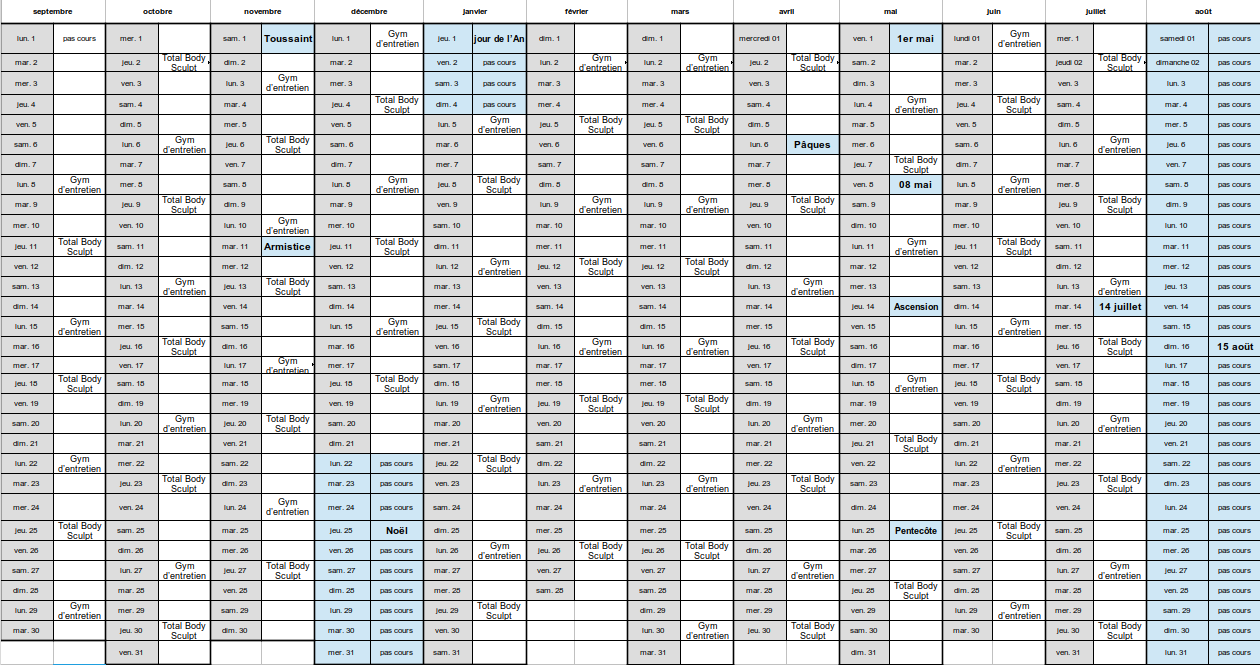 jour,) pas de cours : 1 - pendant les vacances Noël (15 jours) et août, 2 - les jours fériés bien sûr sinon, cours pendant toutes les vacances scolaires ! ![]() |